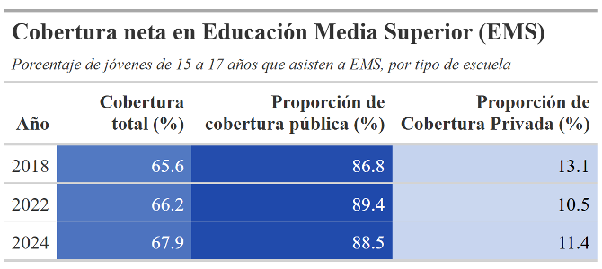 La comparación es inevitable: entre 2012 y 2018, sin becas masivas, pero con dos cambios normativos clave —la obligatoriedad de la media superior (2012)— la cobertura creció nueve puntos porcentuales, de 56.6 % a 65.6 %. Un salto del 15 %. Por el contrario, entre 2018 y 2024, el aumento acumulado fue de apenas 2.3 puntos, de 65.6 % a 67.9 %. Un crecimiento del 3.5% que deja claro que el nuevo enfoque no se tradujo en un impulso real al acceso al bachillerato. Hay que señalar que en 2012 se tenía un sistema de apoyos focalizados a la asistencia a la escuela de personas de hogares en pobreza, establecido para media superior en 2001.