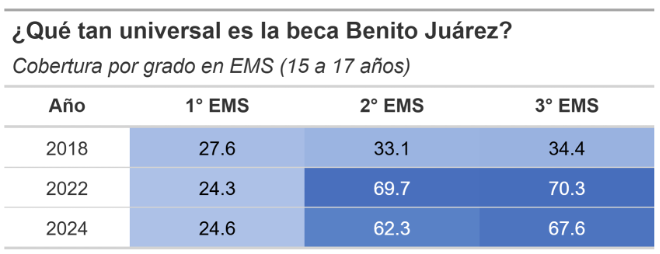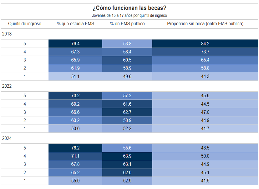 Para responder, analizamos datos de la Encuesta Nacional de Ingresos y Gastos de los Hogares (ENIGH) en tres momentos clave: 2018, antes del cambio de esquema a “universal”; 2022, tras su implementación; y 2024, con el modelo ya consolidado. El análisis se enfocó en jóvenes de 15 a 17 años, edad normativa para cursar la media superior, observando tanto su asistencia escolar como su acceso a becas, con especial atención a su nivel de ingreso, año escolar y entidad federativa.