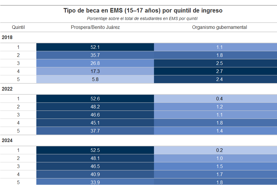 Una de las razones parece estar en un problema operativo: muchos y muchas estudiantes de nuevo ingreso no reciben, al momento de inscribirse, información clara sobre cómo acceder a la beca, o bien, el apoyo se entrega hasta semestres posteriores. Corregir este desfase es clave. Garantizar que el apoyo esté disponible desde el primer día para todos los elegibles, sobre todo para quienes enfrentan barreras económicas, podría reforzar su permanencia en la escuela. Asimismo, coincide en que esta distribución se hace donde hay proporcionalmente menos estudiantes en este nivel educativo y donde hay menos efectividad para atender el abandono escolar. Debido a que la deserción escolar en la media superior se concentra particularmente en el primer año, los beneficiarios del tercero son un universo menor del total del estudiantado del bachillerato.