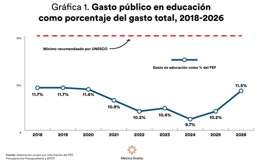 El Gobierno federal también informó que entre 2018 y 2026, los recursos destinados a la educación en el Presupuesto de Egresos de la Federación (PEF) han aumentado 10.2 % en términos reales. Si bien esta cifra es correcta, lo que se omite señalar es la pérdida de peso relativo del gasto educativo dentro del presupuesto total. En la Gráfica 1 se observa cómo durante la administración del expresidente López Obrador, los recursos para educación como porcentaje del PEF pasaron de 11.7 % a 9.7 %.