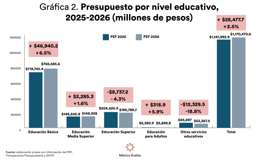 El análisis del Proyecto de Presupuesto de Egresos de la Federación (PPEF) 2026 para el sector educativo en México revela un incremento real del 2.5 % respecto al de 2025 (modificado al segundo trimestre), alcanzando un total de 1,170,470.6 millones de pesos, lo que representa 28,477.6 millones de pesos adicionales. El secretario de educación pública —Mario Delgado— señaló que el incremento es de más de 79 mil millones de pesos entre los dos años. Sin embargo, esta cifra olvida convenientemente la inflación, por lo que en términos reales el incremento es menor al apuntado.