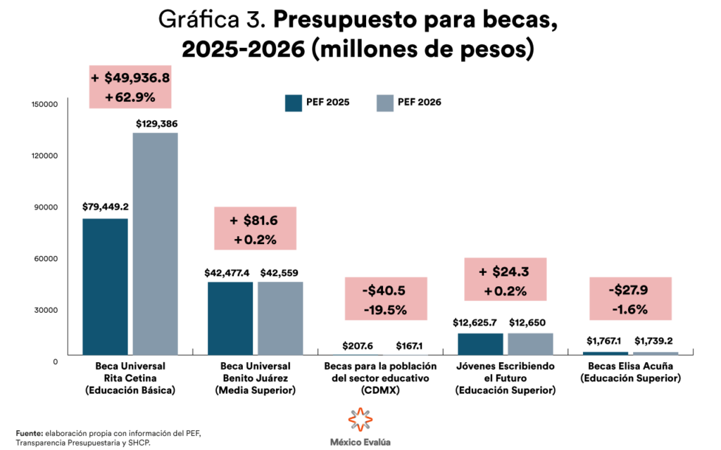Dentro del esquema de prioridades en las transferencias, las becas son las grandes ganadoras. En el PPEF 2026, el total de recursos a becas asciende a 186,501.4 millones de pesos, un incremento del 36.6 % respecto al PEF 2025 (49,974.3 millones adicionales). Como se aprecia en la Gráfica 3, este crecimiento se concentra en la Beca universal de educación Básica Rita Cetina, que aumenta un 62.9 %, con una asignación adicional de 49,936.8 millones para un total de 129,386 millones Este incremento es consistente con el anuncio reciente del coordinador nacional de las becas del bienestar, quien puntualizó que el próximo año se beneficiará gradualmente al 100 % del estudiantado de las primarias públicas.
