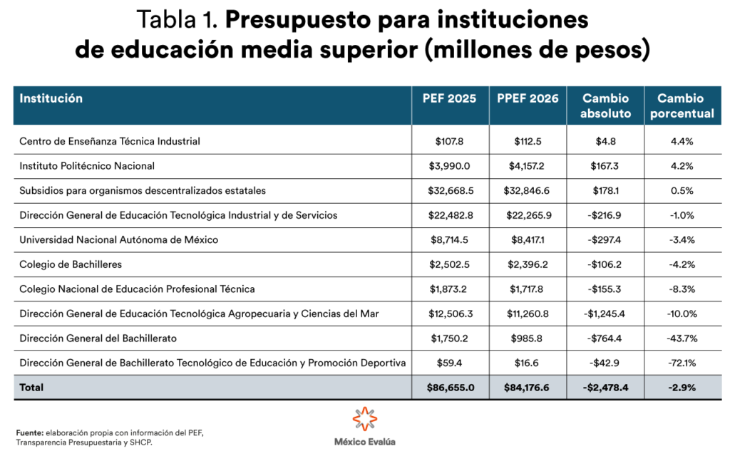 En educación media superior, las cifras parecen mostrar una mejora, pero es un efecto engañoso. En el agregado se presenta un incremento de 1.6 % (2 285 millones de pesos) para 2026 (ver Gráfica 2). Sin embargo, al aislar el gasto en servicios educativos y subsidios para diversos subsistemas (ver Tabla 1), lo que se observa es una reducción de 2.9 %, equivalente a 2 478.4 millones de pesos, al pasar de 86 655.0 a 84 176.6 millones. El supuesto crecimiento se sostiene en las transferencias, en particular del programa LEEN, mientras que la prestación de servicios educativos se deteriora.