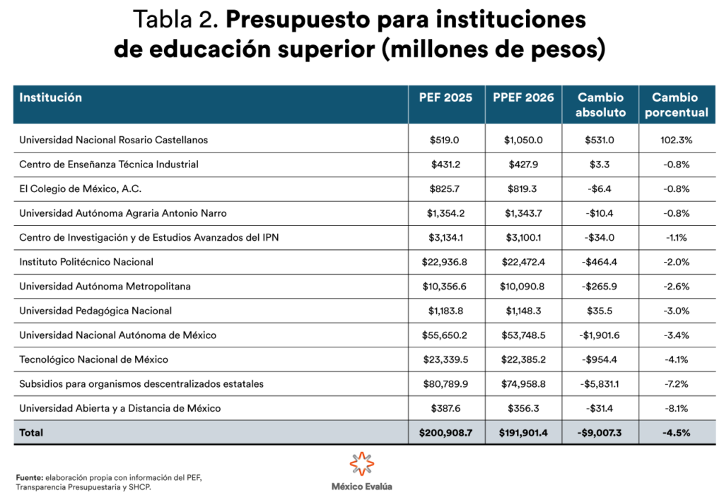 En contraste, las Universidades para el Bienestar Benito Juárez García recibirán un incremento del 19.5 %, sumando 504.8 millones adicionales para un total de 3 090.0 millones. Otro caso llamativo es el de la Universidad Nacional Rosario Castellanos que duplica su presupuesto con un incremento del 102.3 %, recibiendo 531.0 millones adicionales para un total de 1 050.0 millones. Estas asignaciones privilegian a instituciones nuevas a costa de las ya consolidadas. Frente a los retos de cobertura, equidad de oportunidades y calidad de aprendizajes, las decisiones presupuestales deberían orientarse a sumar esfuerzos concurrentes y no a sustituir capacidades previamente construidas.